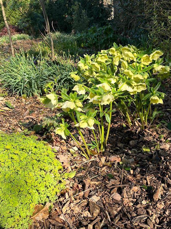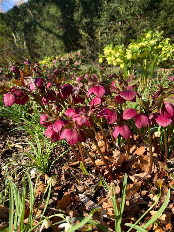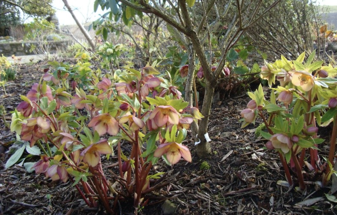 Over 200 hellebores in shades of colours from black/slate shades through purples and pinks to whites, green, yellow/red and pale yellows. The garden is mainly planted with Helleborus x hybridus Ashwood Garden Hybrids ‘Evolution Group’ with large outward facing blooms on strong stems which hold their heads up for all to see the wonderful flower colour and detail even at the back of 20ft deep borders.